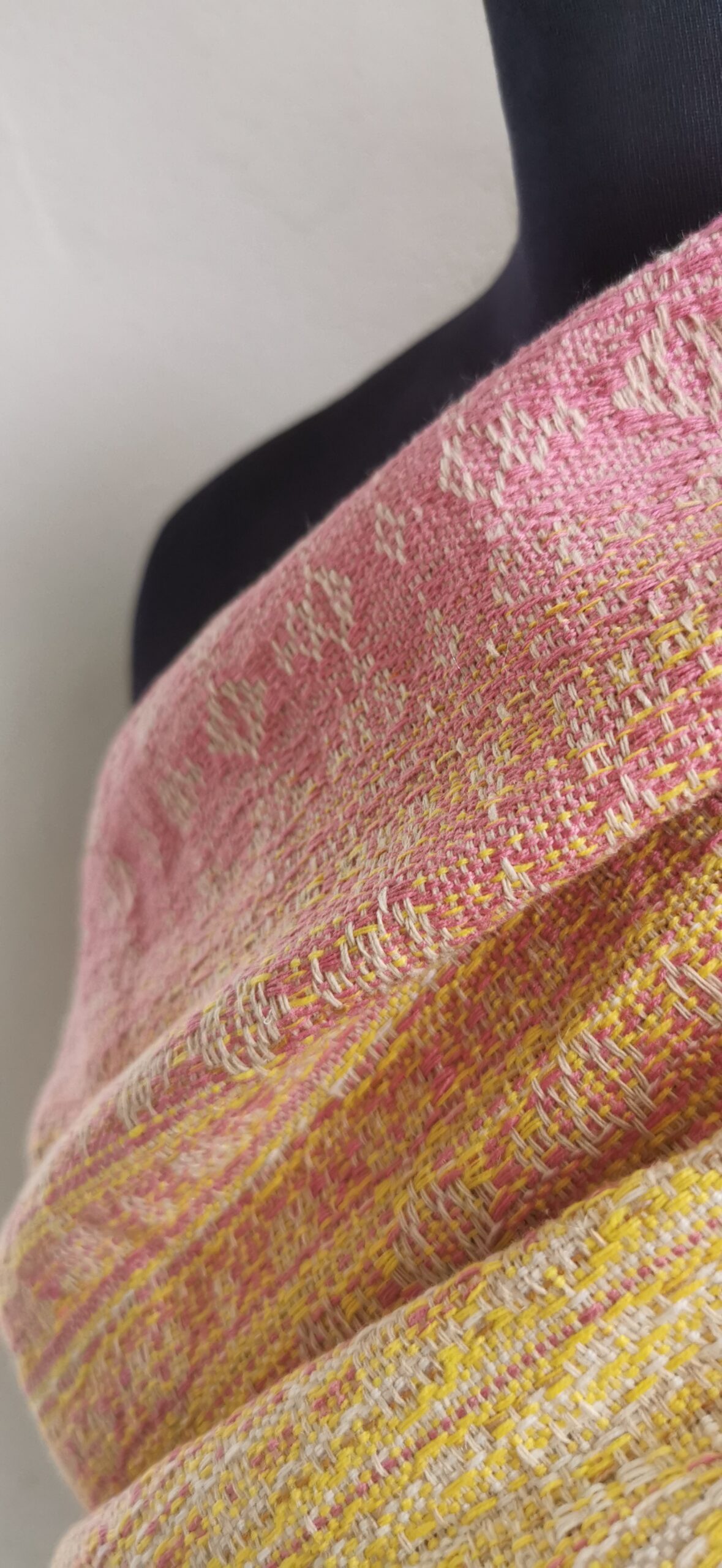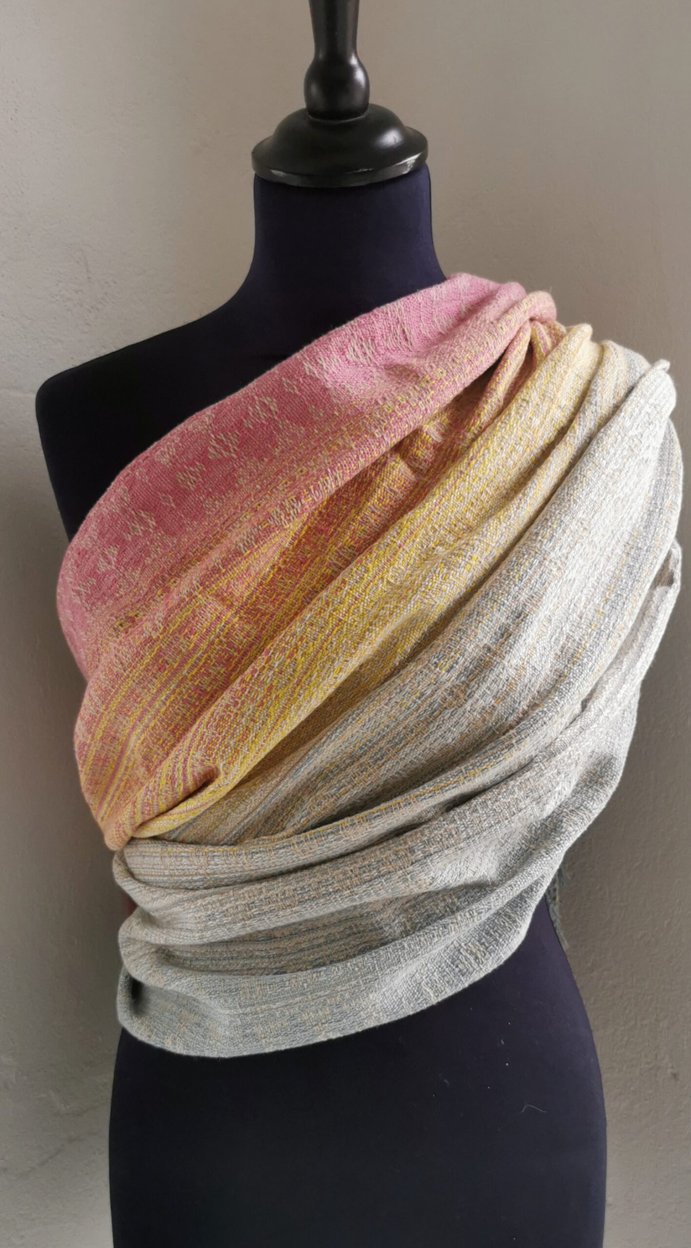 The warp is a stunning and soft graduation in light soft pastel colors mixed in a stunning medley looking almost like the soft clouds on the evening sky just before sunset. The warp is a stunning medley of soft pastel colors ranging from soft blue and grey slowly melting into light yellow and soft rose shades. The weft is a natural ecru color woven in a crackle weave design. The pattern provides the wrap with an amazing softness and a supportive diagonal stretch with more grip than glide. The weft fiber is more sturdy and gives the wrap a strong feel which requires break-in but eventurally will often up and become amazingly soft. This wrap us perfect for experienced wrappers who loves to experience how the handwoven fabric slowly soften up and develop as the wrap is being used. Perfect for larger babies and strong enough to be used into toddlerhood and beyond.