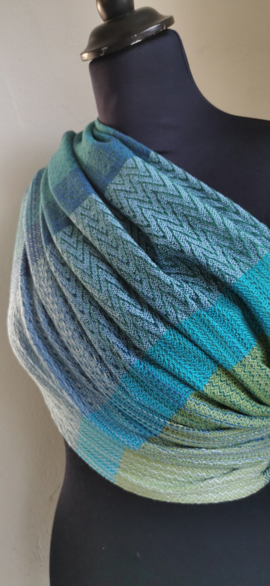 The warp is a stunning bright colored warp in natural light green colors slowly fading into forest green and deep dark green shades. The fabric is woven in our renown ever changing twill pattern, and the weft colors are an changing endlessly in a medley of blue, green and and teal shades, changing for every time the pattern is changing. Due to the carefully arranged color changes and the ever changing patterns the appearance is completely different every time you put on the loop.